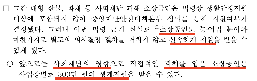 이 개정안이 폭우 피해가 많은 최근에 나왔기 때문에 폭우 피해를 입은 소상공인들이 생활안전지원금을 받을 수 있다고 생각하기 쉽지만 자연재난으로 인한 피해는 이번 개정안에 포함되지 않는다는 점을 알아두시기 바랍니다.