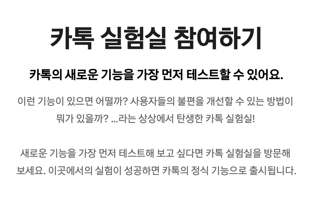 [더 보기] - [설정] - [실험실] - [실험실 이용하기] 체크해 줍니다. 카카오톡의 실험실 기능은 출시 준비 중이지만 아직 정식으로 앱에 탑재되지 않은 기능들을 미리 체험해 볼 수 있는 메뉴라고 보시면 되겠습니다. 단톡방 조용하기 기능뿐만 아니라 그때그때 새로 업데이트되는 기능들을 사용해 볼 수 있으니 자신에게 필요한 기능들이 있다면 사용해 보세요. 카카오톡 실험실 기능 자세히 알아보기