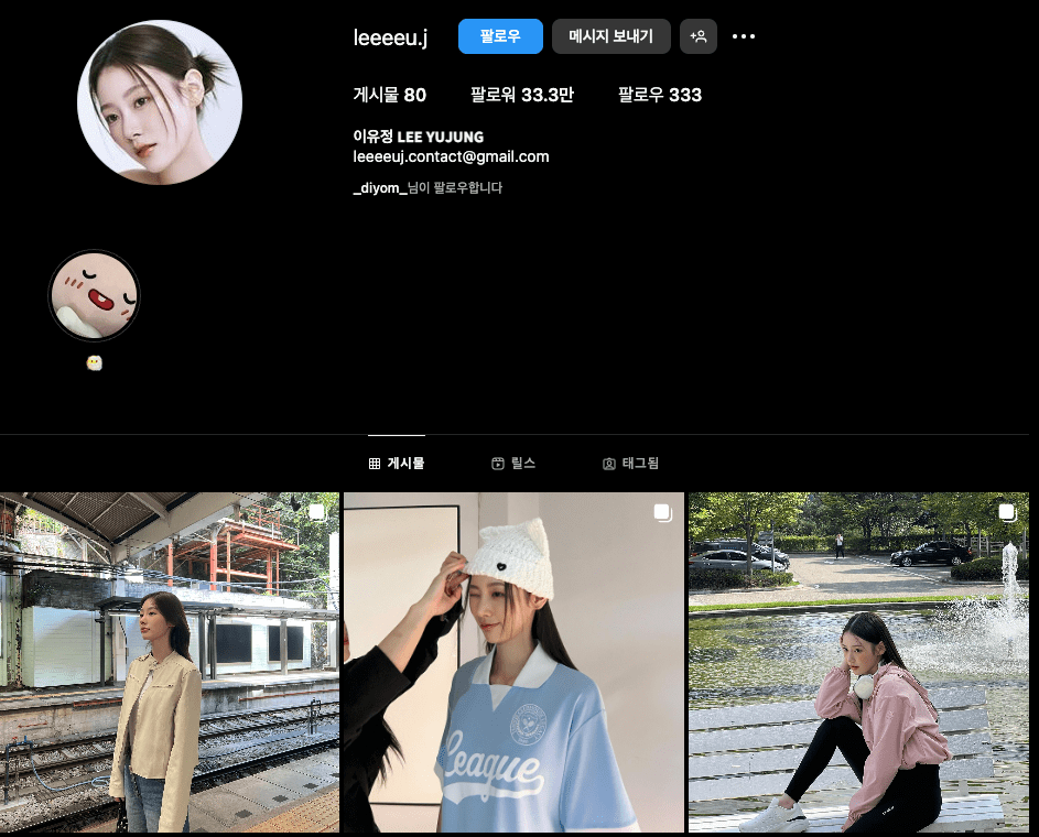 위에 올린 주소 링크 클릭하시거나 아래 사진 누르셔도 유정 인스타 바로가실 수 있습니다. 유정 인스타는 33.3만 명이네요. 팔로우는 333명입니다. 유정은 환승연애3 참가자들 중 가장 화제가 되었던 출연진입니다. 역시 인스타 팔로워도 가장 많이 증가했네요.