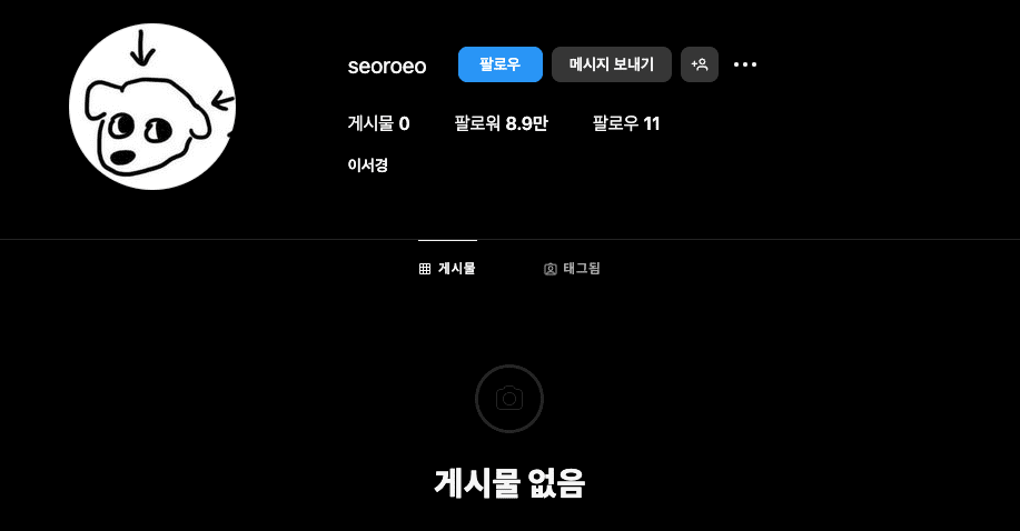 이서경 인스타그램 주소입니다. 아래는 인스타 프로필인데요, 팔로워는 8.9만 명이며, 팔로우는 11명입니다. 이서경 역시 인스타 게시물을 올리지 않았습니다.