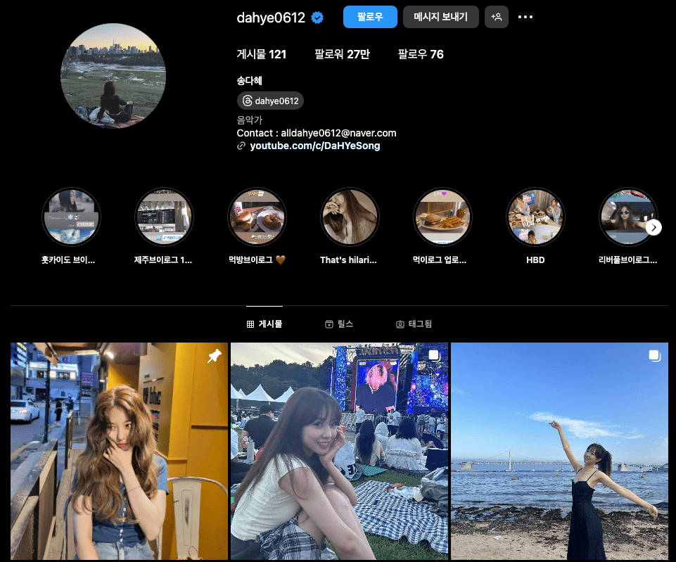 다혜는 연예인답게 인스타 팔로워가 출연진들 중 2위로 많네요. 팔로워는 27만명이며, 팔로우는 76명입니다.