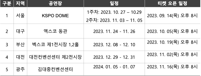 - 서울 공연 관련 세부 사항은 추후 공지될 예매페이지를 확인하시기 바랍니다.